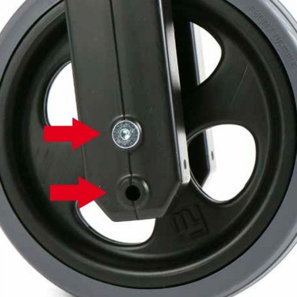 - Lenkerarretierung – die Gabel hat einen begrenzten Drehbereich, der Lenker kann sich somit nicht drehen. Die Verriegelung verhindert eine mögliche Verletzung am Bauches des Kindes.